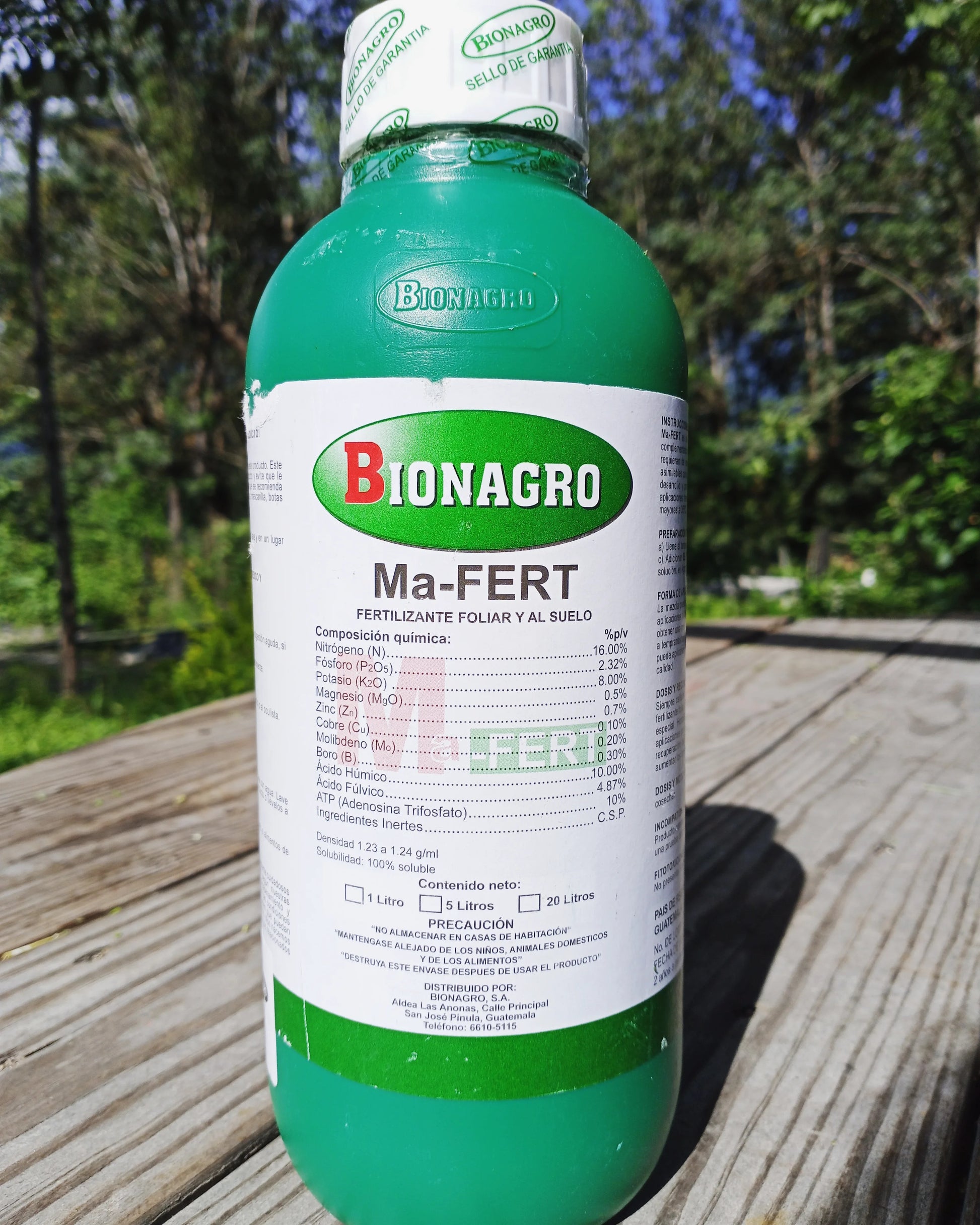 MA-FERT LT- Fertilizante para uso foliar y al suelo a base de NPK, mas un aporte complementario de elementos menores recomendados para ser usados en los cultivos que requieran de estos elementos, los nutrientes en forma liquida son mas rápidamente asimilables por las hojas y las raíces, siendo utilizado en las funciones de crecimiento desarrollo y producción de la planta.